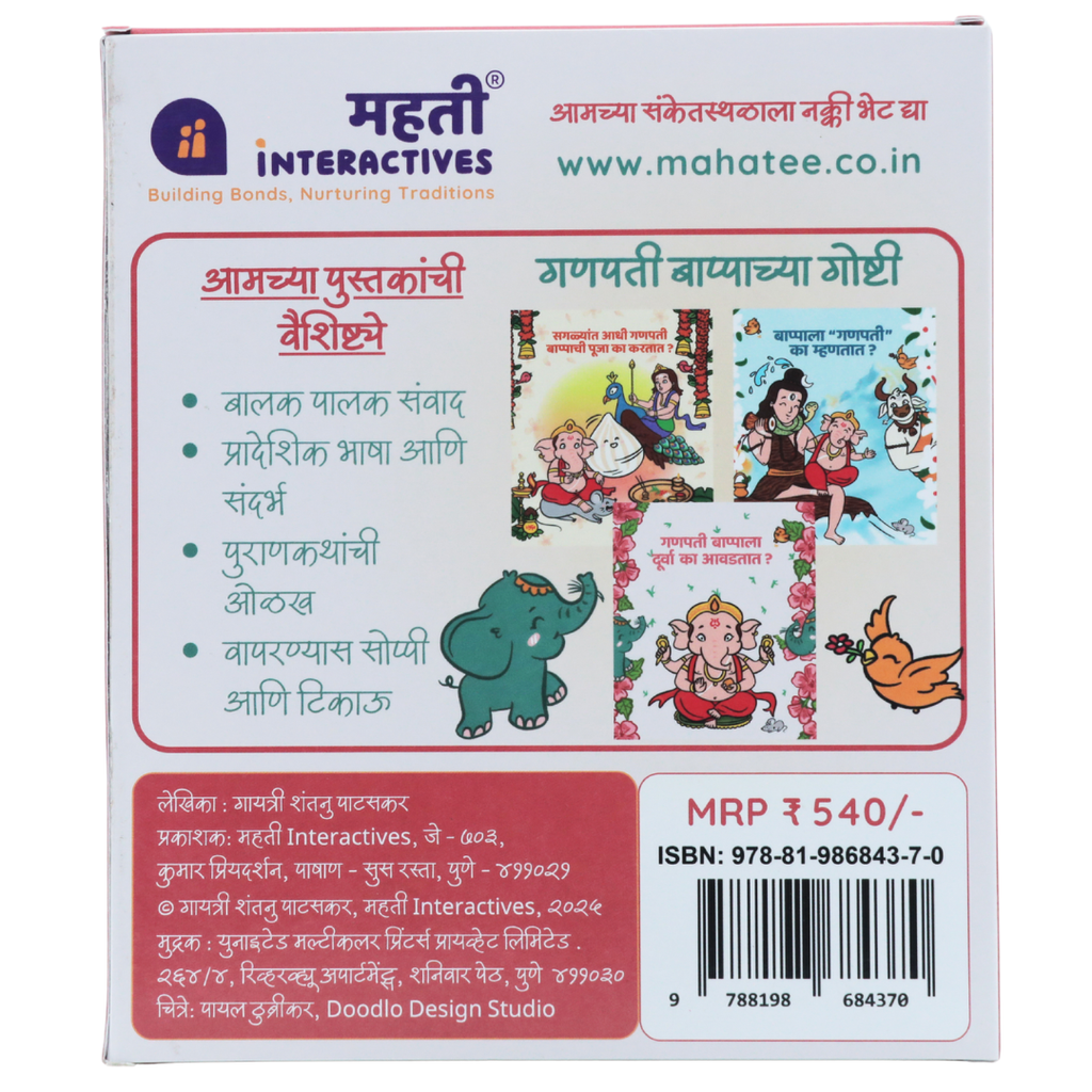 The Ganapati Bappachya Goshti Gift Pack is a special collection of three vibrant board books designed to introduce young children to the origins, significance, and beloved traditions associated with the elephant-headed God.
