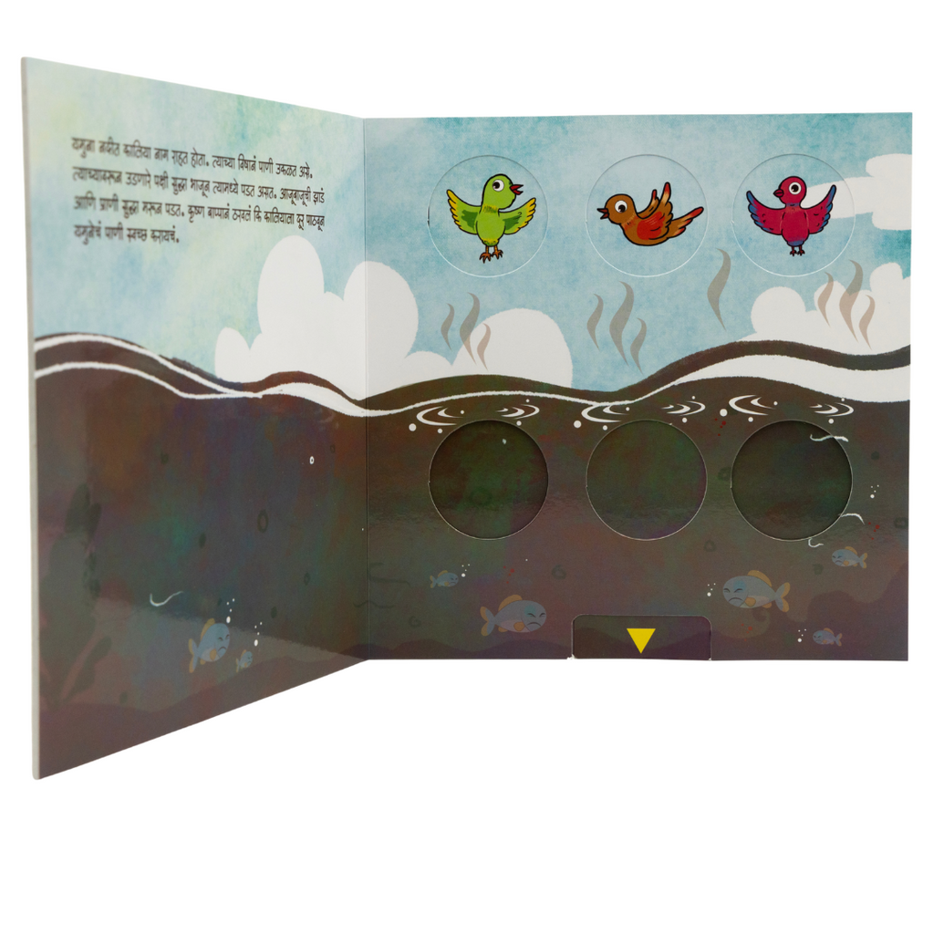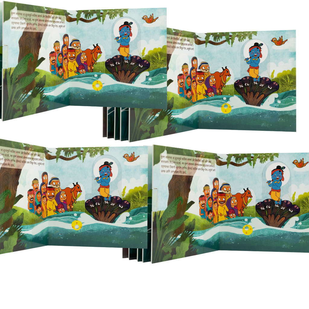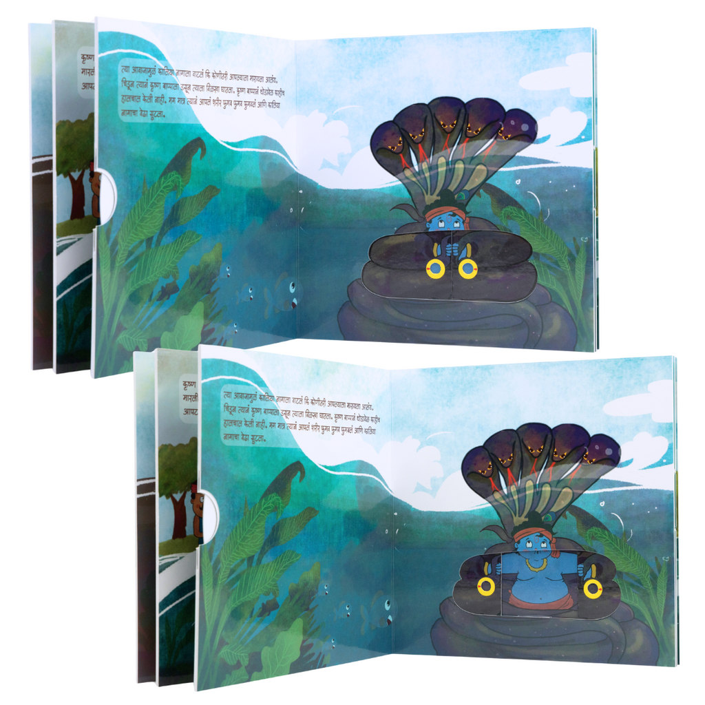 Dive into the enchanting world of 'Krishna Bappana Namavla Kaaliya Naagala,' a book that brings a classic tale to life like never before. This isn't just a book; it's a completely new reading experience for young children. As the first of its kind in Marathi, 'Krishna Bappana Namavla Kaaliya Naagala' uses an innovative push-pull-slide tab format to transform the traditional storybook into an interactive adventure.